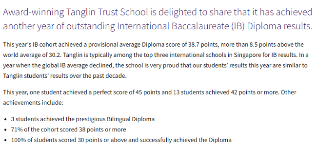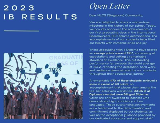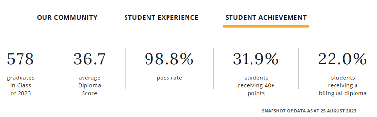 新加坡国际学校当中唯一一所同时提供A-level和IB教学的学校,录取严苛,学额极少。2023年5月学校平均IB成绩为:38.7。